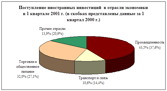 Отраслевая структура иностранных инвестиций в 1 квартале 2001 года характеризуется увеличением вложений направляемых в промышленность на фоне сохранения интереса иностранных инвесторов к сфере торговли и общественного питания, а также транспорта и связи. (Приложения, диаграмма №1)