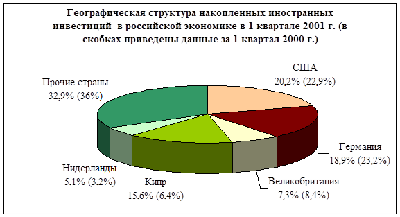 География иностранных инвестиций, поступивших в российскую экономику в первом квартале 2001 года, характеризуется изменением ее структуры. Так, доля Кипра в общем объеме иностранных инвестиций в России составила 16,9% (461 млн. долл, что на 54,5% выше показателя за 1 квартал 2000 г.). Удельный вес Нидерландов оценивается в 14,5% (396 млн. долл., что в 2 раза превышает данные за 1 квартал 2000 г.). Аналогичные данные по США составили 13,9% (380 млн. долл., +5,3% к 1 кварталу 2000 г.). (Приложения, диаграмма №2)
