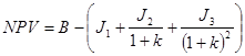 Оскільки чисті зворотні грошові потоки починаються не з 1-го року реалізації проекту, а після закінчення інвестиційної фази, то сучасне значення кумулятивного зворотного грошового потоку можна визначити, віднявши з ануїтету за весь життєвий цикл проекту ануїтет за період інвестування, коли зворотні грошові потоки відсутні, по формулі