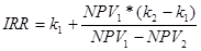 Для наближеного визначення IRR можна використовувати “метод хорди”, заснований на тім, що реальна криволінійна залежність між NPV і k замінюється прямолінійною залежністю між ними. Для реалізації цього методу необхідно установити значення k1 , при якому NPV1 позитивна і значення k2 , при якому NPV2 від’ємна.