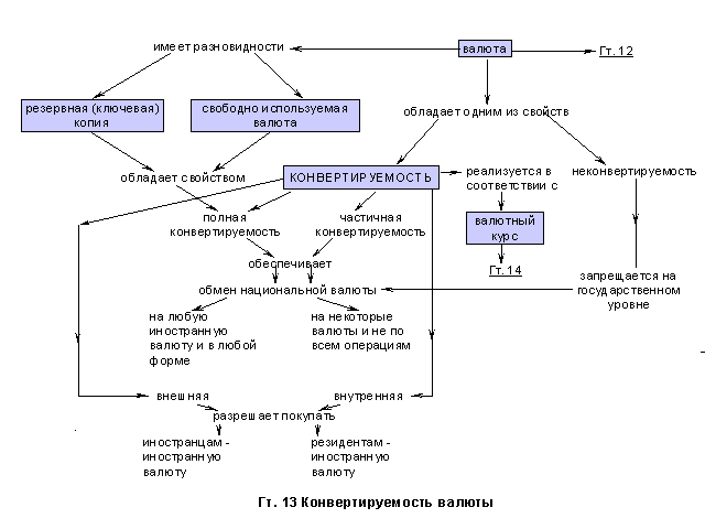 Возможность обмена национальной валюты на валюту другого государства и валюты этого государства на валюту первого государства или третьей страны решается по национальному законодательству. Решающим критерием в этих операциях является конвертируемость валюты, то есть отсутствие ограничений. Ограничения конвертируемости валюты – есть правовые препятствия, связанные с особенностями национального денежного и валютного регулирования. Данные ограничения заключаются в нормативном запрещении, лимитировании или регламентации операций резидентов и нерезидентов с валютой и другими валютными ценностями. Цель таких ограничений – перераспределение валютных ценностей в пользу государства, но, возможно, и в пользу крупных предпринимателей. По тому, как решен этот вопрос в праве страны, валюта может быть: