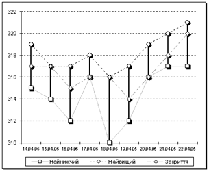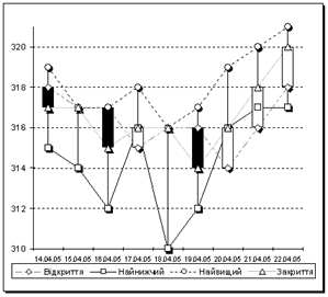 Існує кілька видів діаграм які використаються для технічного аналізу. У даному прикладі всі діаграми показують зміни по днях. Вибір інтервалів діаграм вільний. Всі типи діаграм можуть показувати щоденну, щотижневу, щогодинну й навіть щохвилинну інформацію.