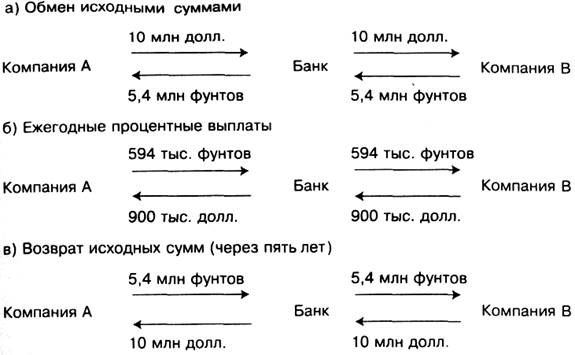 Предположим, американской компании А для финансирования своего английского филиала нужна сумма в английских фунтах с фиксированной процентной ставкой, эквивалентная 10 млн. долл. Она находит английскую фирму (В), которой нужна та же сумма, но в долларах. Две компании обращаются в банк, занимающийся валютными свопами, и с его помощью заключают сделку о том, что он выдаст необходимые кредиты на условиях свопового обменного курса 1 долл. = 0,54 фунта (при установлении обменного курса учитывают возможную его динамику). Оговаривается срок контракта (например, 5 лет) и фиксированные процентные ставки (например, 11 % в фунтах и 9% в долларах). Тогда денежные потоки имеют вид (рис. 1).