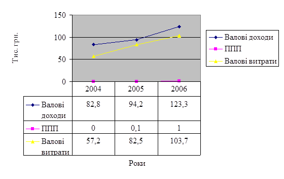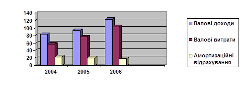 На базовому підприємстві за період 2004 -2006 роки валові доходи в 2004 р. – 82,8 тис. грн., у 2005 р. – 94,2 тис. грн., в 2006 – 123,3 тис. грн..(Додатки З, К, Л ). Валові витрати за 2004 р. - 57,2, за 2005 р. - 77,3, за 2006 р. - 103,7 тис.грн. Амортизаційні відрахування в 2004 р. – 23,3, в 2005 р. – 20,6, 2006 р. - 18,4 тис. грн..