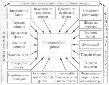 Головним інвестиційним товаром є продукція проектно-дослідницьких, будівельних, монтажних підприємств, фірм та постачальників матеріально-технічних ресурсів, яка загалом забезпечує інвестиційний процес. На інвестиційному ринку працює велика кількість різних посередників, які створюють його інфраструктуру (рис.2).