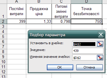 5.1. Використання засобу «Підбір параметра» для визначення і побудови точки беззбитковості при зміні постійних витрат.