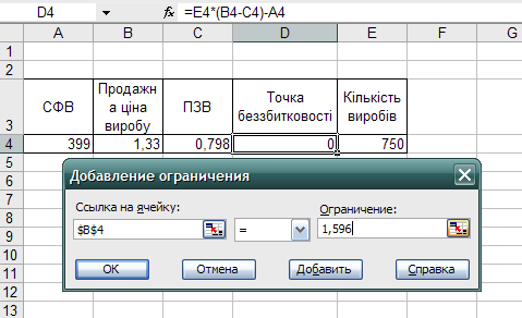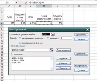Мал. 7. Використання надбудови «Пошук рішення» для оптимізації кількості виробів в точці беззбитковості.
