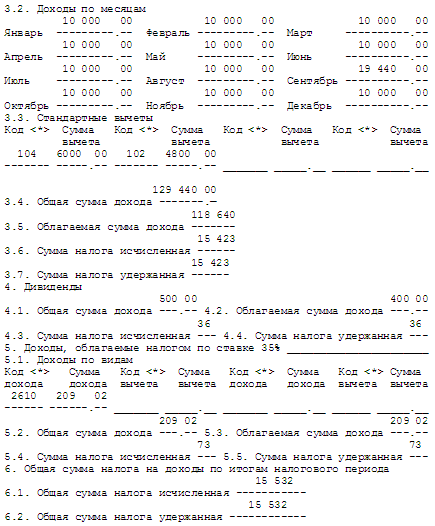 В п.3.2 приводится расшифровка доходов, полученных за год и облагаемых по ставке 13%, по месяцам. В этом пункте суммы доходов также указываются без учета предоставленных стандартных налоговых вычетов.