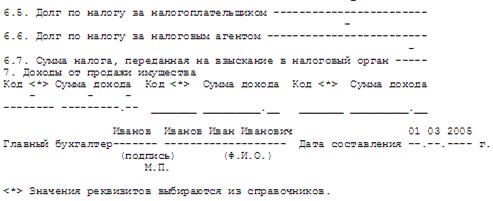 В разд.7 отражаются суммы дохода, полученные физическими лицами - налоговыми резидентами Российской Федерации от реализации любого имущества, принадлежащего им на праве собственности. Код дохода в зависимости от вида проданного имущества берется из справочников. По условиям нашего примера разд.6 и 7 не заполняются.