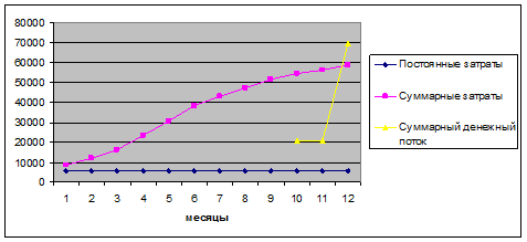 Точка безубыточности находится в координатах Х-месяц = 11,8; У-стоимость = 59000. В этой точке еще не имеет прибыли, но уже не несет убытков. Показатели эластичности показывают как изменяется проект при изменении одного показателя и неизменности остальных. Рискованность проекта находится в промежутке от 101 до 160 (115,8) – это значит, что проект среднерискованный.