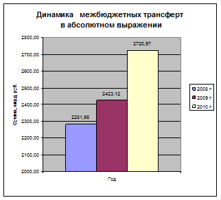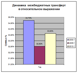 Наибольший удельный вес в классификации расходов занимают межбюджетные трансферты. В 2008 году доля расходования этих средств составляет 34,73%. Если говорить о динамике этого показателя, то уже в следующем году (2009) он снижается на 2,21 %. Но в денежном эквиваленте увеличивается на 141,56 млрд. руб. В среднесрочной перспективе предусмотрено абсолютное увеличение межбюджетных трансфертов к 2010 году до 2 720,97 млрд. рублей, что составляет на 439,41 млрд. руб. больше по отношению к 2008 году. В диаграмме 1 и 2, можно наглядно увидеть, как происходит изменение этого показателя.