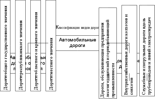 В Российской Федерации по технической классификации установлено 5 категорий дорог, исходя из перспективной интенсивности движения на 20 лет вперед автомобилей в сутки. Классификация дорог показана в таблице 1.1. Классификация видов автомобильных дорог показана на рисунке 1.2.