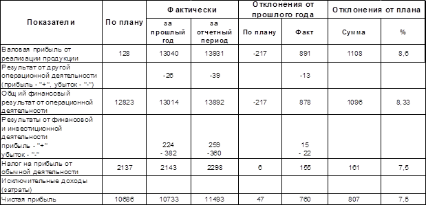 Из приведенных в таблице данных видно, что фактическая чистая прибыль увеличилась сравнительно с планом на 807,0 тыс. грн., или на 7,5%, причем весь прирост практически обеспечен за счет перевыполнения плана по прибыли от реализации товарной продукции (+1108 тыс. грн., или 8,6%). Убытки от другой операционной деятельности уменьшили чистую прибыль на 39 тыс. грн., или на 0,3% (39 х 100 / 12823). Убыточное сальдо от финансовой и инвестиционной деятельности привело к уменьшению чистой прибыли на 101,0 тыс. грн., или на 0,7%(101 х 100 / 12823). Однако, сравнительно с прошлым годом оно уменьшилось на 37,0 тыс. грн., или на 50%, возросли сравнительно с прошлым годом убытки от другой операционной деятельности.