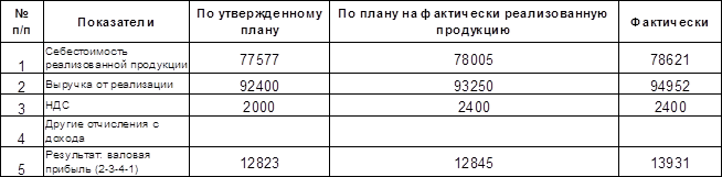 Планом за отчетной год предполагалось уменьшение прибылей от реализации продукции относительно минувшего года на 217,0 тыс. грн. в результате запланированного уменьшения объема реализации продукции с 91661,0 тыс. грн. в минувшем году до 90400,0 тыс. грн., в отчетном. Однако, фактическая величина этого показателя оказалась больше прошлогодней на 891 тыс. грн., что следует оценить положительно. Детальнейшие причины такого изменения проявляют про проведении анализа прибыли от реализации товарной продукции с определением меры влияния конкретных факторов на величину отклонения.