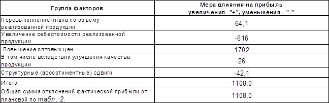 Как видно из данных, приведенных в таблице 3. прибыль от реализации товарной продукции увеличилась сравнительно с планом на 1108 тыс.грн., (13931 — 12823). Рассмотрим конкретнее методику расчета влияния любого из названных факторов.