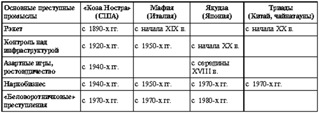 Для развития организованной преступности необходим устойчивый и высокий спрос на запрещенные законом или остродефицитные товары и услуги. Поэтому экономическая история организованной преступности — это поиск лидерами мафий особых рыночных ниш, закрепление и расширение своих позиций в ожесточенной конкурентной борьбе, а также периодическое “перепрофилирование”, вызванное изменениями рыночной конъюнктуры. Экономическая история “долгоживущих” мафиозных сообществ показывает, что при всей национальной специфике набор основных преступных промыслов и даже последовательность их смены очень схожи (см. табл. 1).