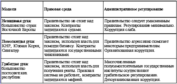 Чтобы подчеркнуть качественные различия национальных путей рыночной модернизации, современные американские экономисты Т. Фрей и А. Шляйфер предложили выделять три основных типа условий развития бизнеса в переходных обществах — модель “невидимой руки” (invisible hand), модель “поддерживающей руки” (helping hand) и модель “грабящей руки” (grabbing hand) (табл. 2). Эти модели различаются, прежде всего, тем, насколько обеспечены права собственности предпринимателей и как это осуществляется: в первом случае эти права защищаются законом, во втором случае — правительственными чиновниками, в третьем случае — мафией.