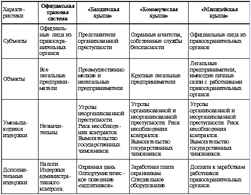 Таким образом, к концу 1990-х гг. в России сложилась “плюралистическая” система защиты прав собственности , в которой легальная государственная правоохранительная деятельность дополняется (а во многом, заменяется) двумя разновидностями нелегальной и одной легальной, но не государственной. В табл. 6 показаны основные сравнительные особенности различных существующих в современной России институтов защиты прав собственности предпринимателей.