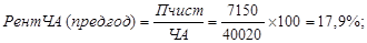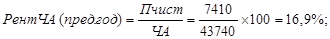 18. Используя данные таблицы 16, рассчитаем влияние рентабельности чистых активов за отчетный год по сравнению с предыдущим годом. Рассчитаем рентабельность чистых активов: