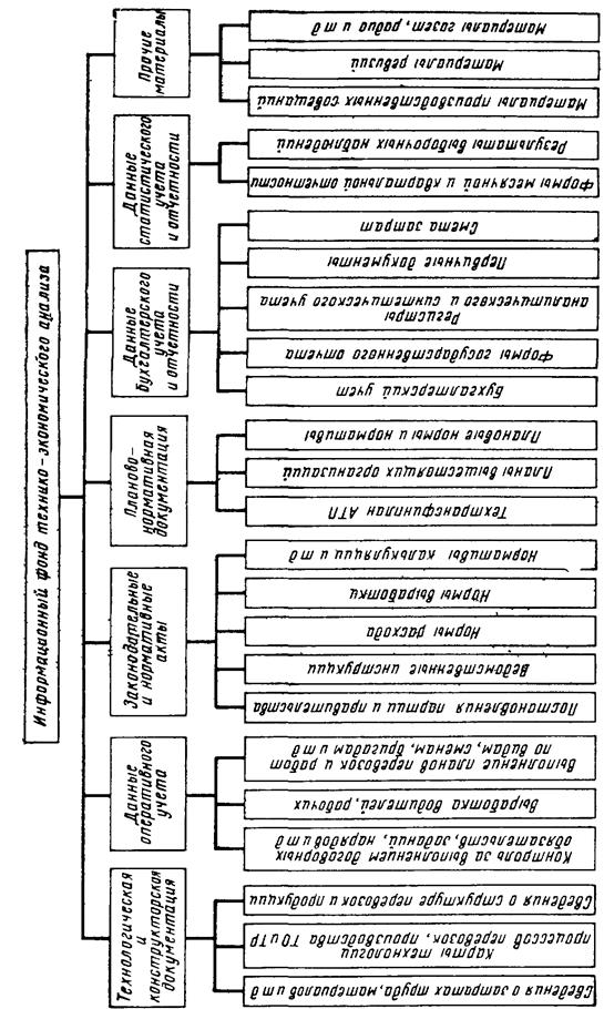 Под информационным обеспечением технико-экономического анализа производственно-хозяйственной деятельности понимается система данных и способов их обработки, позволяющих изучать реальное состояние управляемого объекта, измерять влияние факторов, его определяющих, а также выявлять возможность осуществления управляющих воздействий. Информационный фонд (рис. 1) представляет собой совокупность нормативных, плановых, учетных и внеучетных данных и сведений о характере производства. Информация должна объективно отражать ход производственных процессов, быть достоверной и представлена в удобном для анализа виде. Этому способствует ее отбор, проверка и предварительная обработка.