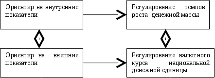 Под валютной интервенцией понимается политика купли-продажи центральным банком иностранной валюты на национальную на валютном рынке. Одним из основных принципов определения стратегии центральных банков служит ориентация на регулирование темпа роста денежной массы в национальной экономики или регулирование валютного курса национальной денежной единицы по отношению к какой-либо стабильной иностранной валюте т.е. на внутренние или внешние показатели (рис 1)6.
