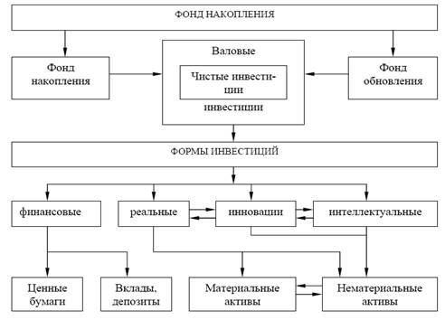 На рис. 1.2 приведена схема классификации инвестиций по формам. Фонд накопления как сберегаемая часть национального дохода является основным источником инвестиций. Условно он может быть подразделен на фонд возмещения и фонд обновления. За счет этих фондов осуществляются соответственно валовые и чистые (в их составе) инвестиции.
