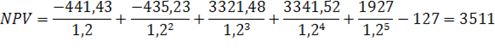 Чистая приведенная стоимость проекта (NPV) оценивается в 3511 тыс. рублей (при ставке дисконтирования 20%);