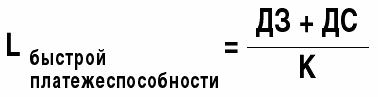 При расчете коэффициента быстрой платежеспособности L(2) , из числителя исключается такой показатель как запасы, то есть материалы, полуфабрикаты, готовая продукция и товары. Коэффициент принимает следующий вид: