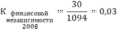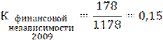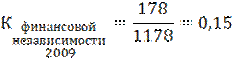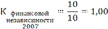 Коэффициент финансовой независимости в 2007 году составил 1,00 постольку, поскольку единственной статьей в пассиве баланса явилась статья «Уставный капитал». В 2008 и 2009 гг., как уже было отмечено ранее, структура пассива баланса претерпела значительные изменения, что достаточно сильно повлияло на рассматриваемый нами показатель. Анализируя его полученные значения, можно сказать, что доля собственного капитала крайне низкая.