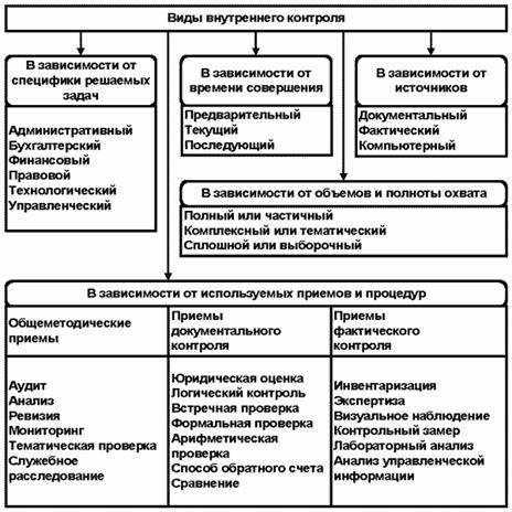 - в зависимости от используемых приемов и процедур при проведении внутреннего контроля - общеметодические приемы: аудит, анализ, ревизия, мониторинг и др.; приемы документального контроля: юридическая оценка, логический контроль, встречная проверка, формальная проверка, способ обратного счета и др.; приемы фактического контроля: инвентаризация, экспертиза, визуальное наблюдение, контрольный замер, лабораторный анализ и др.
