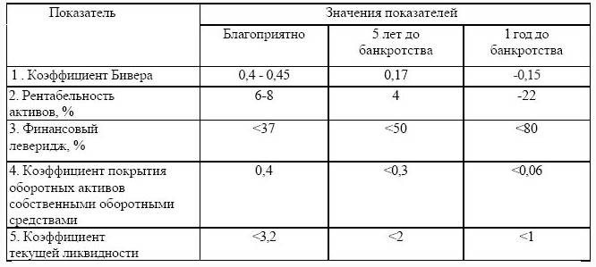 | Методика У.Бивера | Простота расчета и возможность применения в условиях ограниченного объема информации о предприятии. Дает прогноз в течение какого времени предприятие может обанкротиться. | Весовые коэффициенты для индикаторов не предусмотрены и итоговый коэффициент вероятности банкротства не рассчитывается. |