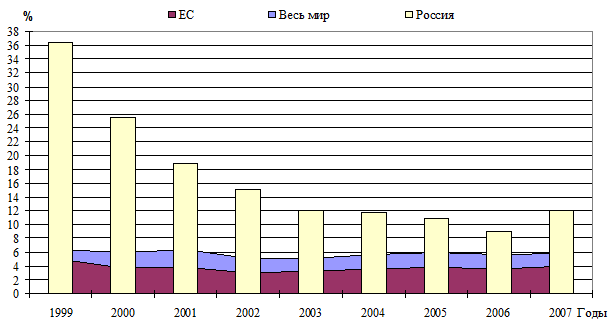 Рис. 1 . Динамика инфляции в РФ, ЕС и в мире