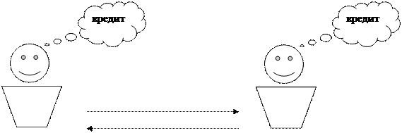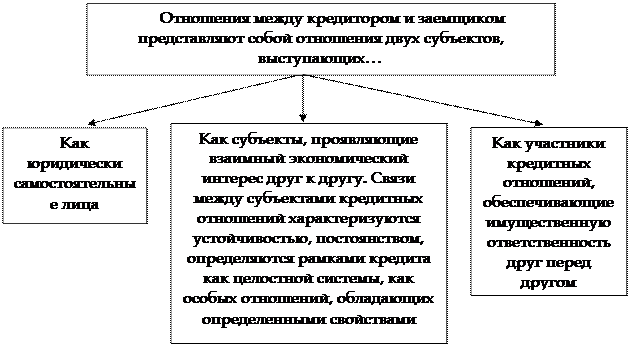 Как объект исследования, можно стоит выделить, что кредит состоит из элементов, находящихся в тесном взаимодействии друг с другом. Такими элементами являются прежде всего субъекты его отношений. Пространственно они могут быть удалены друг от друга на разные расстояния, однако характер их взаимных обязательств от этого не меняется. В кредитной сделке субъекты отношений всегда выступают как кредитор и заемщик. (Рис.1)