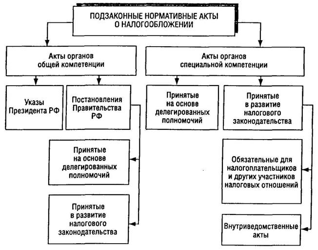 Необходимость такого регулирования отчасти объяснялась низким качеством законов о налогах, их чрезмерной «лаконичностью». Налоговый кодекс Российской Федерации устанавливает, что федеральные органы исполнительной власти, органы исполнительной власти субъектов Российской Федерации, исполнительные органы местного самоуправления и органы государственных внебюджетных фондов в предусмотренных законодательством о налогах и сборах случаях издают нормативные правовые акты по вопросам, связанным с налогообложением и сборами, которые не могут изменять или дополнять законодательство о налогах и сборах.