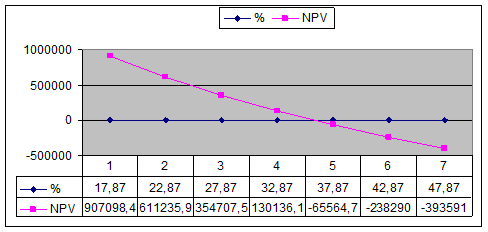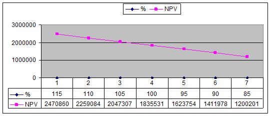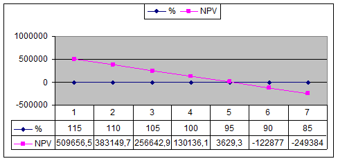 | NPV | 509656,5 | 383149,7 | 256642,9 | 130136,1 | 3629,3 | -122877 | -249384 |