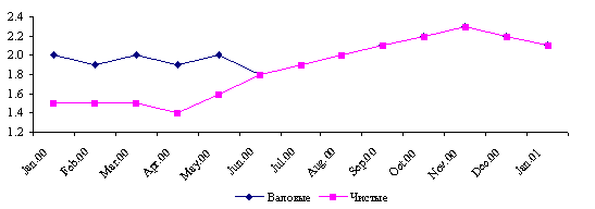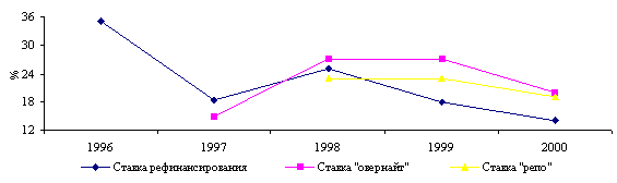 Официальные ставки. С целью ориентации банков второго уровня на снижение ставок по кредитам Национальный Банк в течение года поддерживал ставку рефинансирования слабо положительной в реальном выражении и понижал официальные ставки. За год ставка рефинансирования снизилась с 18% до 14%, ставка по кредитам "овернайт" - с 27 до 21%, ставка по операциям "репо" - с 23 до 19% (рис.2.4) .