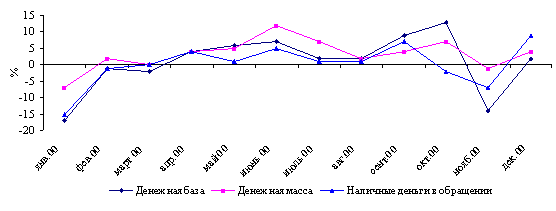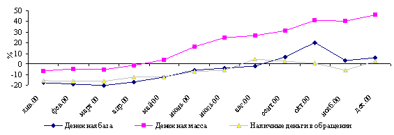 Поведение денежных агрегатов в течение отчетного периода было обусловлено характером сложившихся в прошлом тенденций. Так, в начале года наблюдалось сезонное снижение денежных агрегатов. Денежная база и наличные деньги в обращении продолжали снижаться в течение I квартала и превысили уровень на начало года только в сентябре. Кривые темпов роста денежной базы и денежной массы (рис.2.5, 2.6) показывают, что в течение года наблюдается синхронность в их поведении. Однако, вследствие опережающего темпа роста депозитов в банковской системе, денежная масса, уже в мае превысила уровень на начало года.