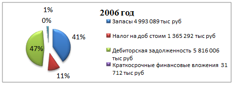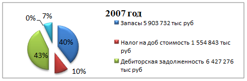 Доля запасов фирмы возросла на 20%. Больше всего изменений в запасах сырья, материалов и других аналогичных ценностей. (Увеличение с 3 715 689 тыс. руб. в 2006 до 4 501 453 тыс. руб. в 2007 году). Такое положение вещей означает определенные экономические риски для предприятия (см ниже).