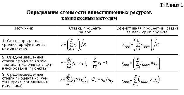 При определении стоимости инвестиционных ресурсов комплексным методом предлагается оценивать величину затрат предприятия по тем же самым критериям: ставке процента за год и эффективной процентной ставке за весь срок проекта.