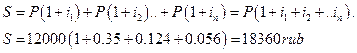 4. Вкладчик положил в банк 12 000 руб. в начале 1998 г. Банк выплачивал простые проценты с процентными ставками на уровне 70% от ставки рефинансирования ЦБ РФ в 1998 г., 40% от той же ставки в 1999 г. и 20% от ставки рефинансирования в 2000 г. Будем считать, что ставка рефинансирования ЦБ РФ была следующей: в 1998 г. – 50% годовых; 1999 г. – 31% годовых; 2000 г. – 28% годовых. В предположении, что вкладчик не снимал денег со своего счета, определите, какая сумма будет на его счете в начале 2001 г.