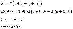 5. Вкладчик положил в банк 20 000 руб. в начале 2003 г. Банк начислял простые проценты в размере 80% от ставки рефинансирования ЦБ РФ в течение следующего года, 60% от этой ставки – в течение второго года и 30% – в течение третьего года. В предположении, что вкладчик не снимал денег со своего счета и ставка рефинансирования не менялась в течение трех лет, определите ставку рефинансирования ЦБ РФ, если в начале третьего года на счете вкладчика было 28 000 руб.