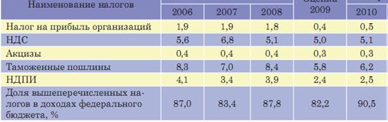 Рисунок 12. Динамика структуры налоговых доходов федерального бюджета в период 2006–2010 ГГ. (% ВВП) [19]