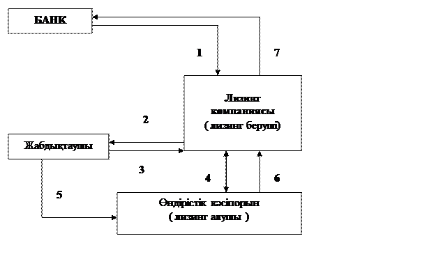 1 – банк лизинг компаниясы арасында несиелік келісімшарт жасалып , несие беріледі; 2 – лизинг компаниясы алған несиені құрал-жабдық үшін жабдықтаушыға төлейді; 3 – жабдықтаушы лизинг компаниясына құрал-жабдығын сатады; 4 – лизинг компаниясы мен лизинг алушы кәсіпорын арасында лизингтік келісімшарт жасалады; 5 – жабдықтаушы құрал-жабдықпен жабдықтайды; 6 – лизингті алушы кәсіпорын пайдаланғаны үшін лизингтік төлемдер жүргізеді; 7 – лизинг компаниясы несие беруші банкке несие үшін төлемдерін төлейді.