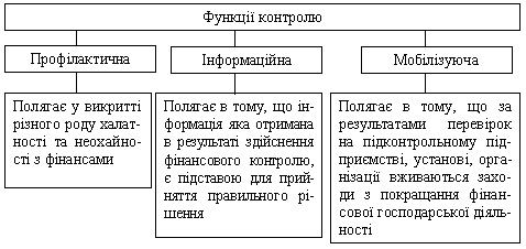 Контроль – є однією з основних функцій органів управління, яка полягає в систематичній перевірці об’єктів контролю, виявленні відхилень, що допущені у процесі виконання управлінських рішень та встановленні їх причин. Фінансовий контроль є складовою частиною державного контролю. Фінансовий контроль – це цілеспрямована діяльність законодавчих і виконавчих органів публічної влади та недержавних організацій, що спрямована на забезпечення законності, фінансової дисципліни і раціональності у процесі мобілізації, розподілу та використання коштів централізованих і децентралізованих грошових фондів держави з метою найефективнішого соціально-економічного розвитку усіх суб’єктів правовідносин.
