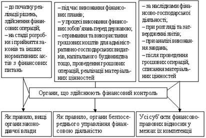 Попередній фінансовий контроль здійснюється на стадії складання, розгляду і затвердження фінансових планів підприємств, кошторисів бюджетних організацій; передує здійсненню господарських операцій і покликаний не допускати нераціонального витрачання фінансових ресурсів і тим самим попереджувати нанесення збитку діяльності суб'єкта господарювання. Поточний контроль постійно здійснюється для попередження фінансової дисципліни в процесі залучення і витрачання грошових коштів, виконання підприємствами, організаціями, установами зобов’язань перед бюджетом. Наступний контроль здійснюється після здійснення фінансових операцій для визначення стану фінансової дисципліни, виявлення її порушень.