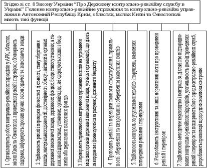 Головним завданням Державної контрольно-ревізійної служби є здійснення державного контролю за витрачанням коштів і матеріальних цінностей, їх схоронністю, станом та достовірністю бухобліку і звітності в міністерствах, відомствах, державних комітетах, державних фондах, бюджетних організаціях, а також на підприємствах і в організаціях, які отримують кошти з державних бюджетів усіх рівнів. Для реалізації поставлених завдань органи контрольно-ревізійної служби мають право проводити ревізії і перевірки, обслідування, припинення сумнівних операцій, інвентаризації, залучення фахівців, отримувати пояснення і довідки від усіх інстанцій, вимагати усунути виявлені порушення, стягувати недоотримані кошти, накладати адміністративні стягнення, застосовувати фінансові санкції до порушників.