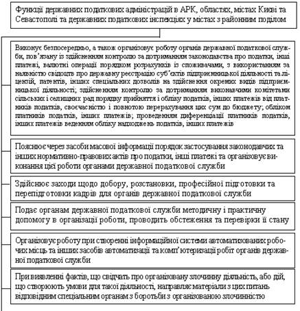 Концепція органів державної податкової служби України при здійсненні фінансового контролю визначається за організаційно-правовим статусом. Статус державної податкової служби в Україні, її функції та правові основи діяльності визначає Закон України “Про державну податкову службу в Україні” від 4.12.90 із наступними змінами та доповненнями. Функції ДПА України у сфері фінансового контролю визначає ст. 4 Положення про Державну податкову адміністрацію України 1. Видає у випадках, передбачених законом, нормативно-правові акти і методичні рекомендації з питань оподаткування 2. Затверджує форми податкових розрахунків, звітів, декларацій та інших документів, які пов’язані з обчисленням і сплатою податків та інших платежів, декларацій про валютні цінності, зразок документа, що затверджує реєстрацію фізичної особи-платника податків та інших обов’язкових платежів, форму повідомлення про відкриття або закриття юридичними і фізичними особами-суб'єктами підприємницької діяльності банківських рахунків, а також форми звітів про роботу, проведену органами державної податкової служби 3. Виконує безпосередньо, а також організовує роботу органів державної податкової служби, що пов’язана із: – здійсненням контролю за дотриманням законодавства про податки та інші платежі, валютні операції, порядком розрахунків із споживачами з використанням реєстраторів розрахункових операцій, лімітів, готівки в касах та її використанням для розрахунків за товари, роботи, послуги, а також контролю за наявністю свідоцтв про державну реєстрацію суб’єктів підприємницької діяльності та ліцензій, патентів, інших спеціальних дозволів на здійснення окремих видів підприємницької діяльності; – здійсненням контролю за дотриманням виконавчими комітетами сільських і селищних рад порядку прийняття і обліку податків, інших платежів від платників, своєчасністю і повнотою перерахування цих сум до бюджету; обліком платників податків та інших платежів залежно від сум, сплачених ними, веденням обліку надходжень податків, інших платежів; – проведенням роботи щодо боротьби з незаконним обігом алкогольних напоїв та тютюнових виробів, веденням реєстрів імпортерів, експортерів, оптових та роздрібних торговців, місць зберігання алкогольних напоїв та тютюнових виробів, участю в розробленні пропозицій щодо основних напрямів державної політики і проектів державних програм у сфері боротьби з незаконним обігом алкогольних напоїв та тютюнових виробів, організацією виконання актів законодавства у межах своїх повноважень, здійсненням систематичного контролю за їх реалізацією, узагальненням практики застосування законодавства (застосування фінансових санкцій до суб’єктів підприємницької діяльності за порушення законодавства про виробництво і обіг спирту етилового, коньячного, плодового, алкогольних напоїв і тютюнових виробів), здійсненням заходів щодо вилучення та знищення або передачі на промислову переробку алкогольних напоїв, тютюнових виробів, що були незаконно вироблені чи знаходилися в незаконному обігу; – здійсненням контролю за погашенням податкової заборгованості платниками податків, інших платежів, у тому числі тими, майно яких перебуває в податковій заставі 4. Пояснює через засоби масової інформації порядок застосування законодавчих 