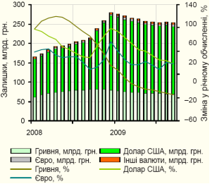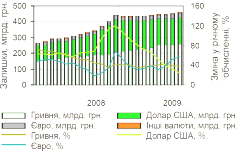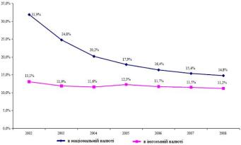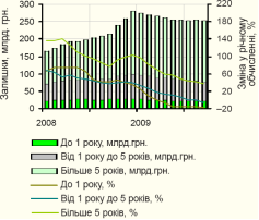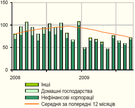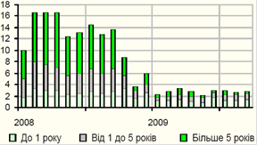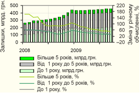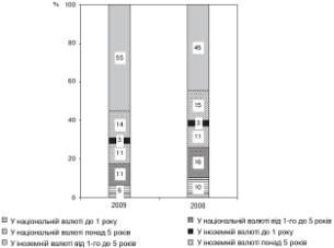 У 2009 році спостерігалась тенденція до зростання кредитів, наданих сектору нефінансових корпорацій іншими депозитними корпораціями (банками), що було зумовлене зростанням кредитів у національній валюті, спрямованих у поточну діяльність. Порівняно з 2008 роком залишки за кредитами збільшились на 4,7 млрд. грн., або на 1,0%, до 457,5 млрд. грн. Водночас, незважаючи на зростання обсягів кредитування з початку 2009 року, спостерігалося постійне уповільнення темпів їх приросту у річному обчисленні до 32,9% порівняно з 36,5% на кінець 2008 року. Перевага надавалась короткостроковим кредитам, що певною мірою пояснювалось зменшенням депозитів, залучених іншими депозитними корпораціями на довгостроковий період. На наш погляд, причиною такої динаміки було зменшення ресурсної бази комерційних банків.