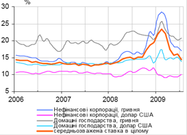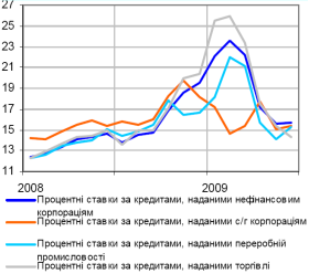 Хоча економічна активність у 2009 році пожвавилася, питання щодо вартості наданих кредитів залишилося актуальним. Тому, на наш погляд, особливої уваги потребує аналіз процентних ставок з точки зору підтримки комерційними банками сектору НФК. Зазначимо, що тут спостерігається досить значна диференціація процентних ставок: максимальними були процентні ставки за кредитами, наданими корпораціям «рибальства, рибництва» (23,3%), в той час за кредитами, наданими сільськогосподарським підприємствам 15,7%.
