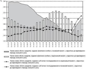За видами економічної діяльності уповільнення темпів приросту кредитів у річному обчисленні спостерігалося за всіма основними галузями. Найбільше зниження відбулося за кредитами, наданими на операції з нерухомим майном (з 117,4% на кінець 2008 року до 107,9% на кінець 2009 року) та сільськогосподарським корпораціям (з 26,6% до 20,8% відповідно). Найбільше зростання (на 4,1 млрд. грн.) спостерігалося за кредитами, наданими торговельним корпораціям у національній валюті, які, із метою поповнення обігових коштів, надавались в основному на строк до 1 року. Збільшення заборгованості на 0,8 млрд. грн. відмічалось за кредитами, наданими підприємствам переробної промисловості як у національній, так і в іноземній валютах, що більшою мірою було зумовлено зростанням кредитів на виробництво харчових продуктів, напоїв.